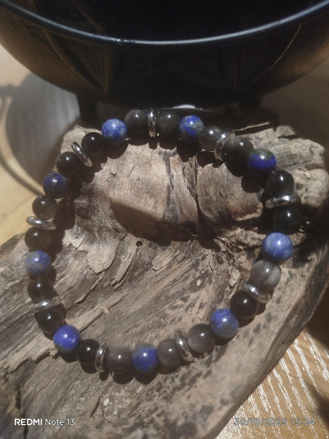 Composé de Lapis-lazuli et d’Obsidienne argentée, il stimule l’intuition, la lucidité et apporte une protection bienveillante.